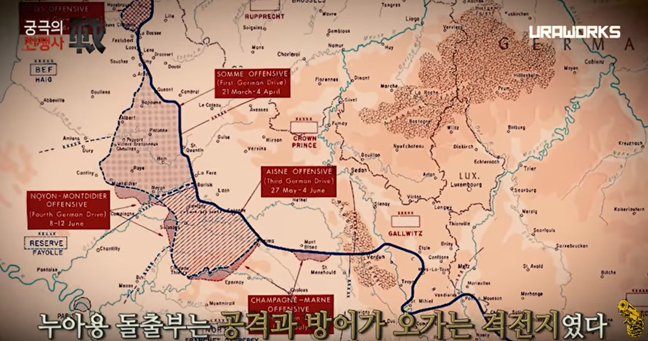 ㅡ 누아용 돌출부의 문제 : 돌출된 전선은 방어에도 불리했고 많은 자원이 투입되는 소모전 양상으로 흘러감.